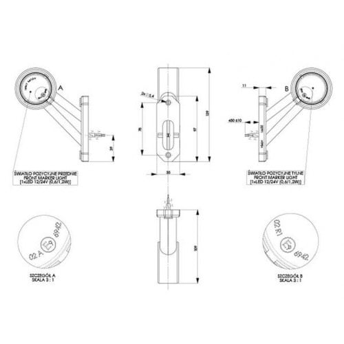 Multivoltage led breedtelamp te gebruiken tussen de 10 en 30 volt DC. Dit is een kort en schuin model. Voor gebruik aan de linker zijkant.